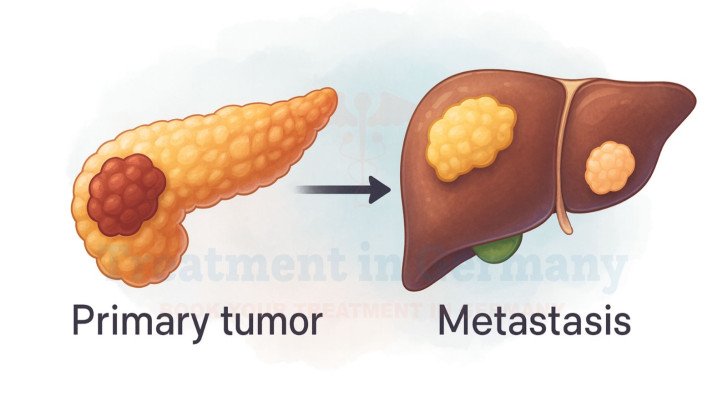 Pancreatic cancer with liver metastasis in Germany, starts in the pancreas and spreads most commonly to the liver due to the proximity and shared blood circulation between the two organs. When the cancer reaches the liver, it is considered advanced and requires immediate, multidisciplinary care. Common symptoms include abdominal or back pain, jaundice, nausea, unintended weight loss, dark urine, and digestive difficulties.